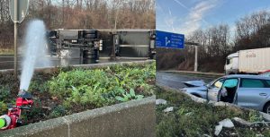 Feuerwehr aus dem ganzen Kreis im Großeinsatz, Warnung vor Brandgeruch im Bereich Mahnert Auf der A46, zwischen den Anschlussstellen Haan-Ost und Haan-West, ist am Donnerstagmittag, 11. Dezember 2025, gegen 13.50 Uhr ein mit Gefahrgut beladener Lkw verunglückt und auf die Seite gestürzt. Die elektrisch angetriebene Zugmaschine ist im Bereich der Hochvoltbatterie in Brand geraten. Vermutlich ist ein PKW von hinten aufgefahren. Daraufhin wurde die