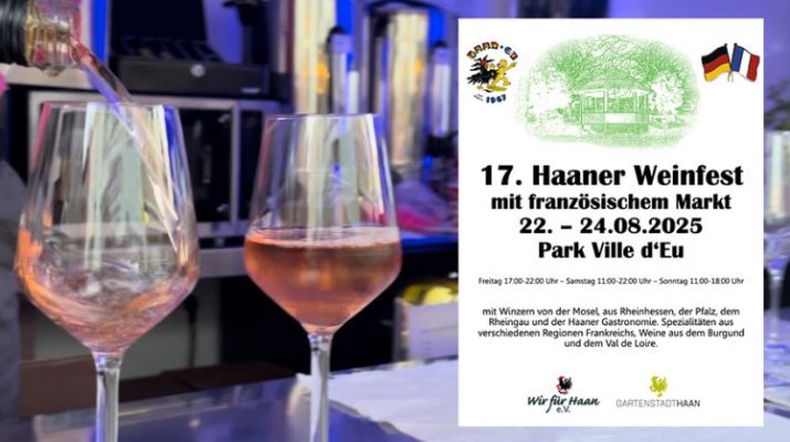 Den Haanerinnen und Haanern muss man ihr Weinfest nicht erklären. Sie kommen von selbst, denn es ist besonders: Vom 22. bis 24. August 2025 findet es im Park Ville d’Eu bereits zum 17. Mal statt ⎻ wie immer ergänzt um den französischen Markt.