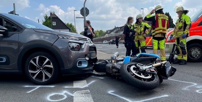 Nach bisherigen Erkenntnissen befuhr eine 23-jährige Fahrerin aus Herne gegen 12.45 Uhr mit ihrem Citroen C3 die Elberfelder Straße aus Richtung Wuppertal in Richtung der Autobahn A46. Beim Abbiegen nach links in die Gruitener Straße, auf Höhe einer Tankstelle, übersah sie offenbar den entgegenkommenden Motorradfahrer aus Haan.
