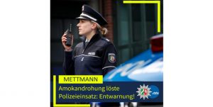 Entwarnung am Nachmittag Eine auf eine Tür geschmierte Amokandrohung hat am Mittwoch, 11. März 2026, einen größeren Polizeieinsatz an einem Schulkomplex in Mettmann ausgelöst. Nach ersten Ermittlungen konnte die Polizei jedoch am frühen Nachmittag Entwarnung geben. Entdeckt worden war die Drohung gegen 11.45 Uhr vom Hausmeister der Gesamtschule am Borner Weg. Mit einem Permanentstift hatte eine bislang unbekannte Person