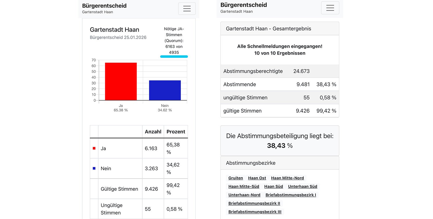 Das war ein Kopf-an-Kopf Rennen heute Abend bei der Auszählung der Stimmen für den Bürgerentscheid Rathausneubau. Die Haanerinnen und Haaner haben entschieden und mehrheitlich für eine neue Planung des Rathausneubaus gestimmt bzw. für ein Stop der aktuellen Planungen. Damit sind sie der Initiative „Stopp des Mega-Schuldenprojektes Rathausneubau Haan“ gefolgt, die sich für das Bürgerbegehren und den heutigen Bürgerentscheid eingesetzt hat und sich immer wieder für eine möglichst kostengünstigere Planung ausgesprochen hat.
