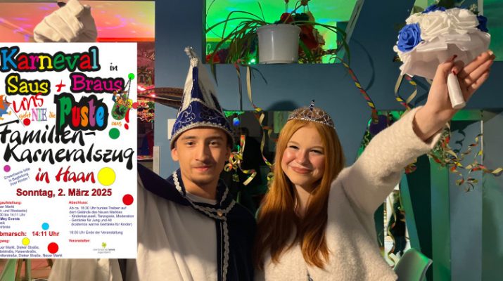 Am Tulpensonntag, 2. März 2025, zieht wieder der Familien-Karnevalszug durch die Haaner Innenstadt! In diesem Jahr lautet das Motto „Karneval in Saus + Braus – Uns geht nie die Puste aus!“